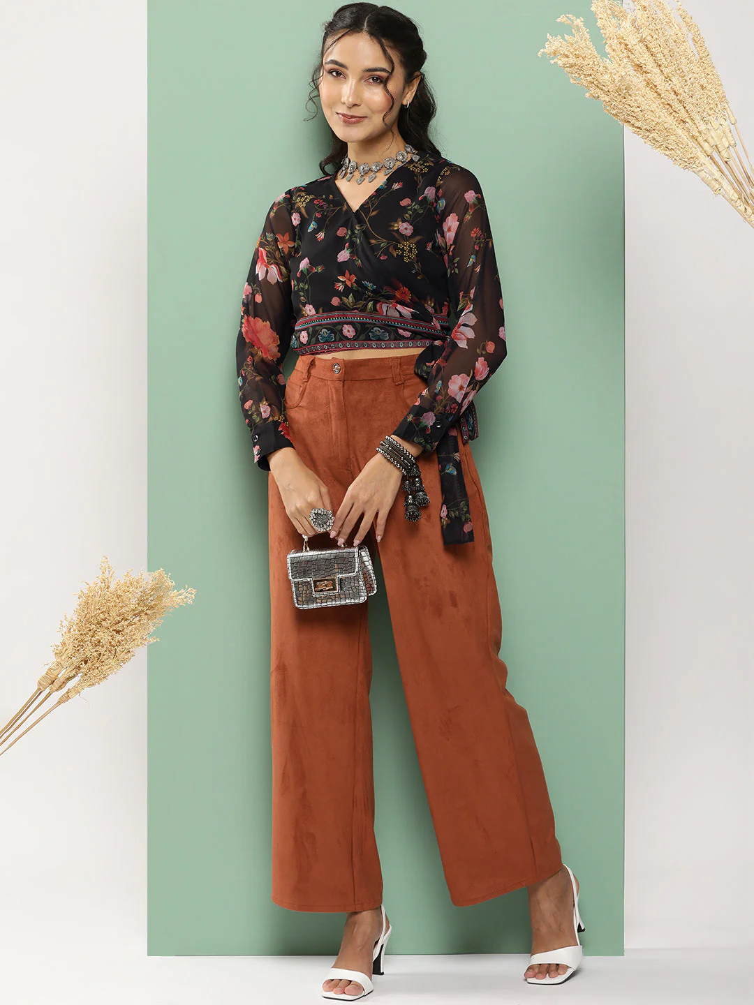 Black Printed Top, Has A V-Neck With Tie-Up Detail, And Long Sleeves