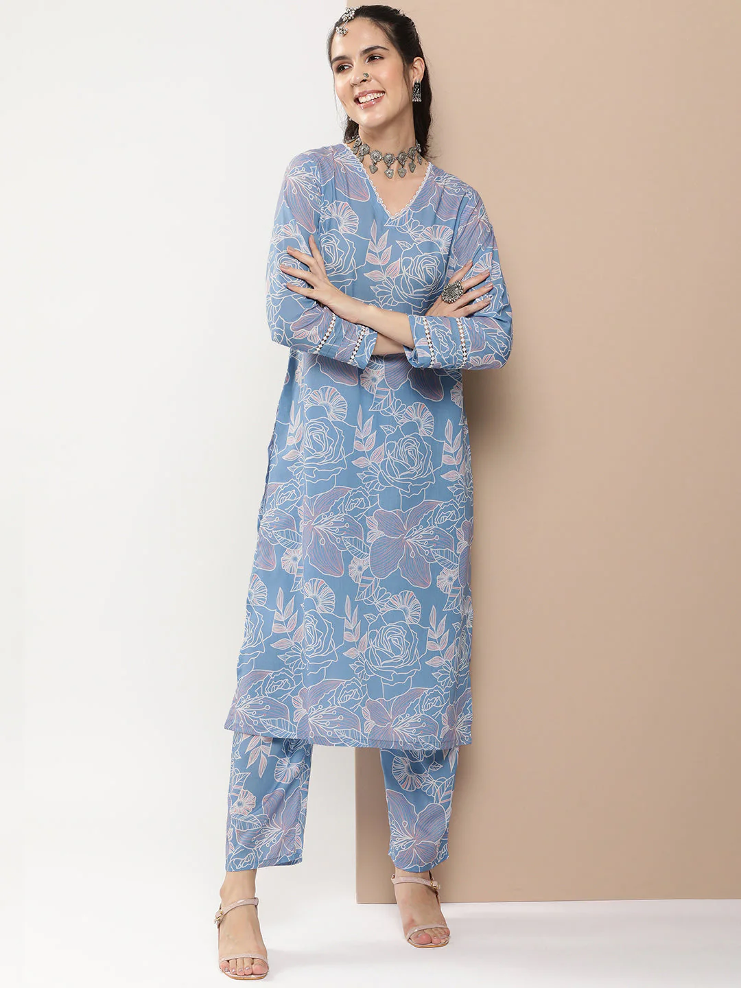 Blue Floral Print Kurta With Lace Details, Has V-Neck, Three-Quarter Sleeves With Lace Detailing, Calf Length With Blue Floral Print Palazzos.