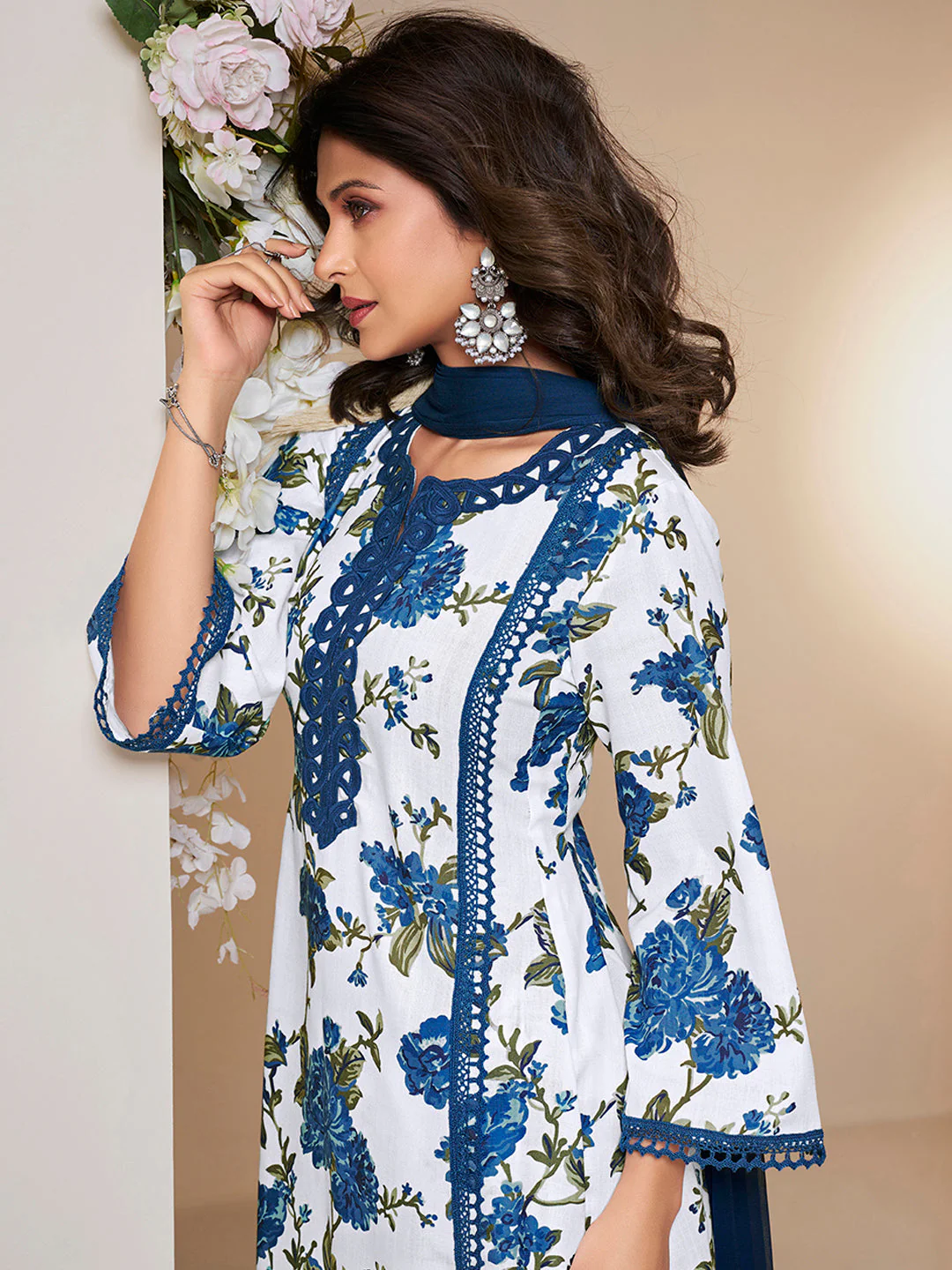 Blue Floral Printed Flared Kurta with lace details on pannels, Round neck with lace details, has a flared sleeves with laces Calf length, Falred Hem & with Palazzos & Solid Taping Dupatta.