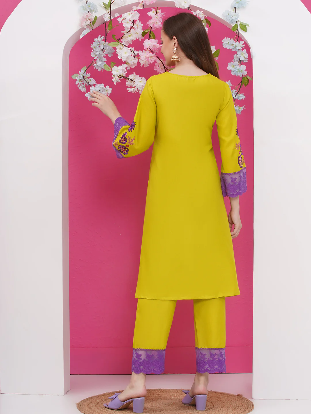 Lime Green Kurta with purple Thread Embroidered with palazzo Dupatta set .A-line shape, Regular style, Round neck, Three Quarter sleeves, & Â Embroidered yoke & sleeves, calf length with straight hem solid palazzo elastic waistband with lace detailed.