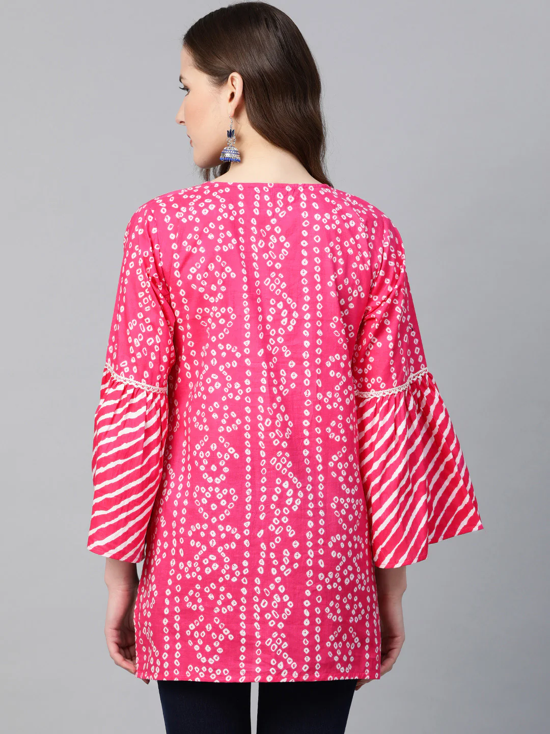 Pink And White Bandhani Print Tunic, Has A Round Neck, And Three-Quarter Bell Sleeves