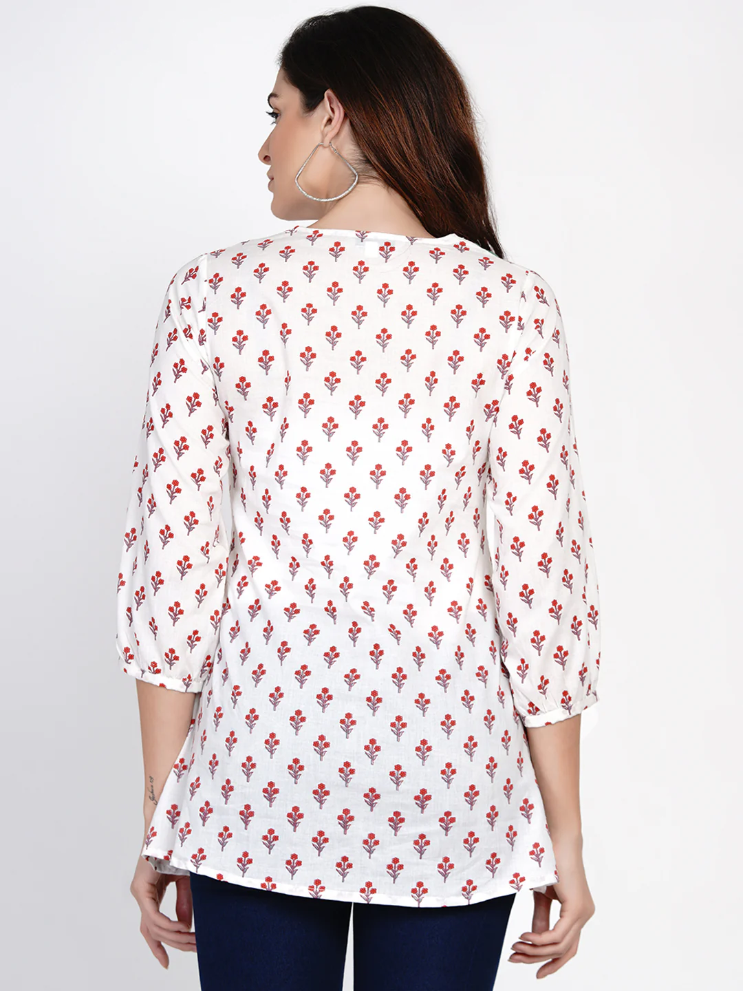 White Printed Tunic With Embroidered Yoke, Has A Round Tie-Up Neck, Three-Quarter Sleeves