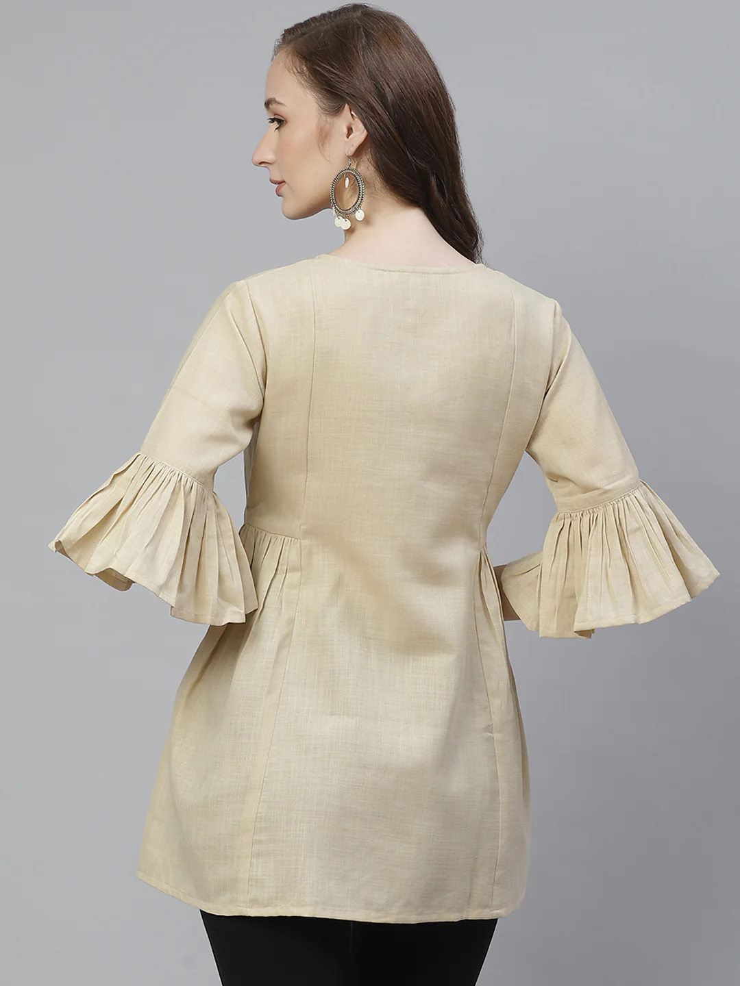 Beige Solid Tunic With Gotta Patti Detail, Has A Keyhole Neck, Three-Quarter Bell Sleeve