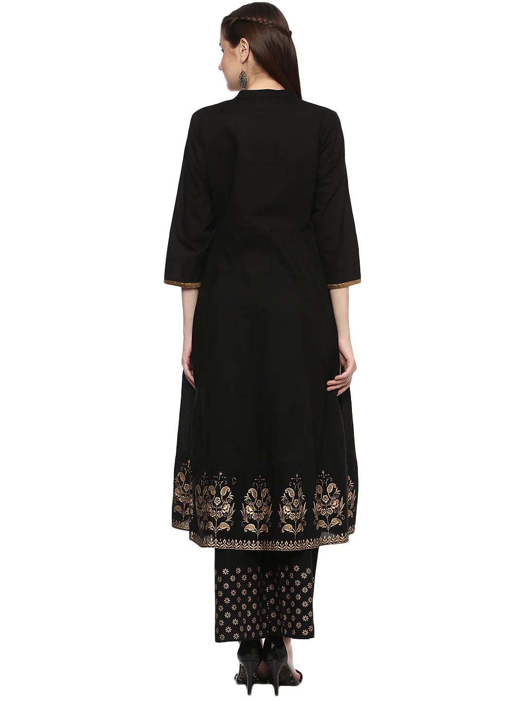 Black And Golden Solid A-Line Calf Length Kurta With Printed Details, Has A Mandarin Collar, Three-Quarter Sleeves, Flared Hem With Black And Golden Solid Palazzos With Woven Design On It, Elasticated Waistband With Drawstring Closure.