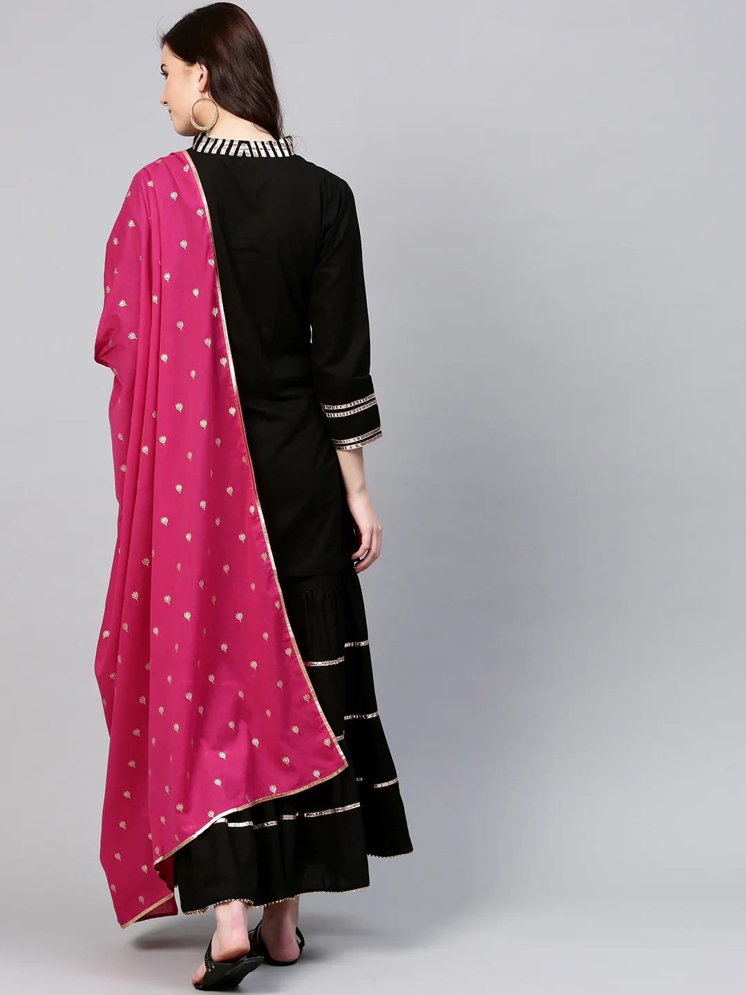 Black And Pink Solid Kurta With Sharara And Dupatta.