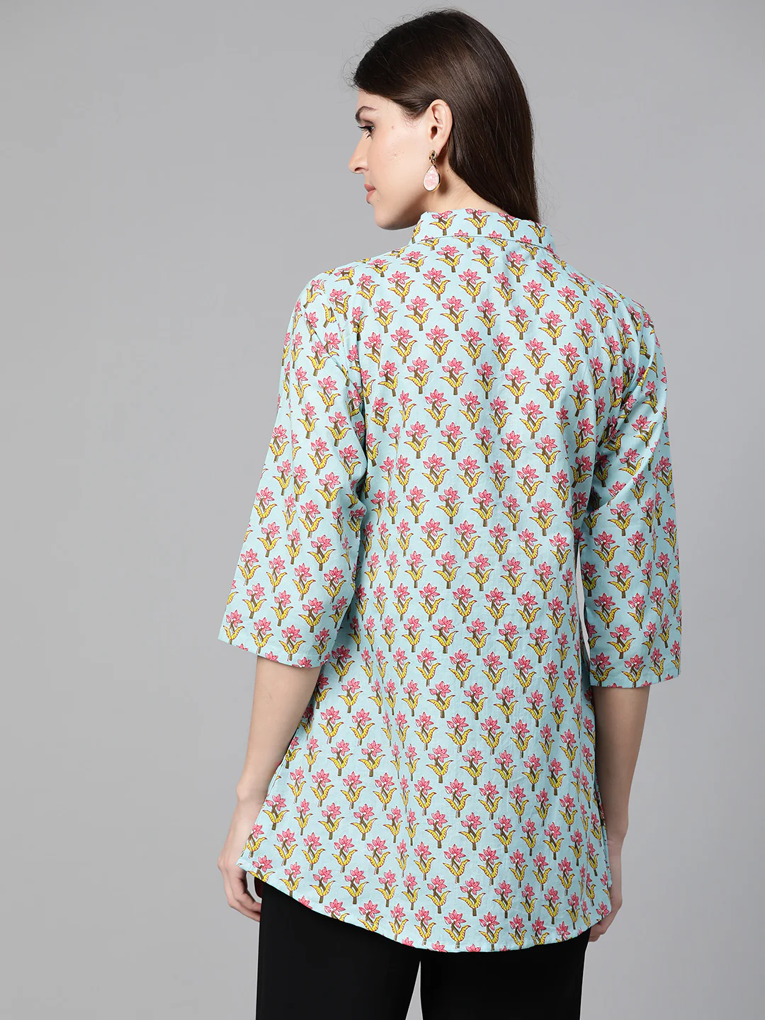 Blue And Pink Floral Print Shirt Tunic, Has A Shirt Collar, Three-Quarter Sleeves