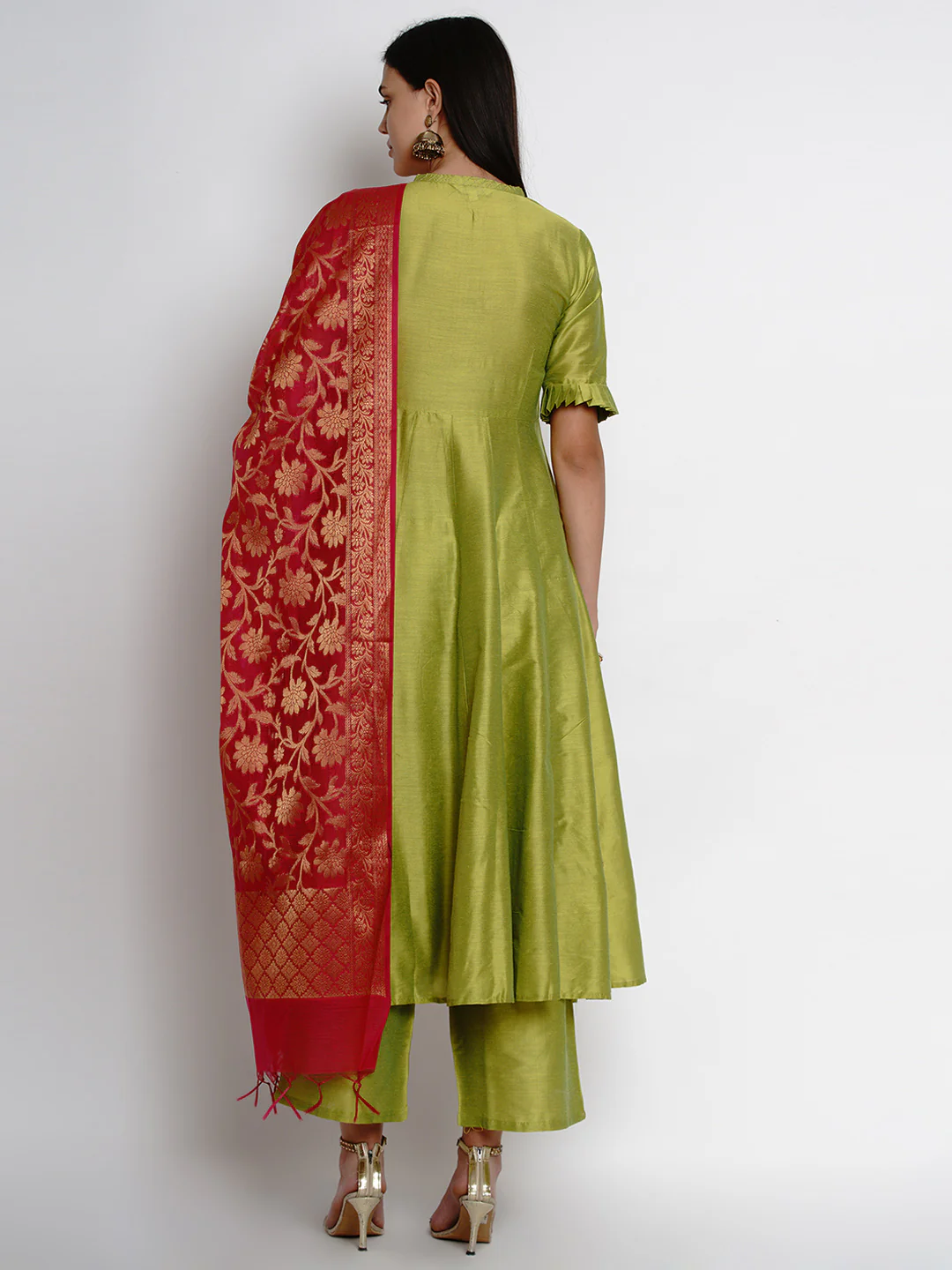 Lime Green Anarkali Calf Length Kurta, Has A Mandarin Collar, Three-Quarter Sleeves, Flared Hem, Green Solid Palazzos, Slip-On Closure, Red Self Design Woven Dupatta With Tasselled Borders