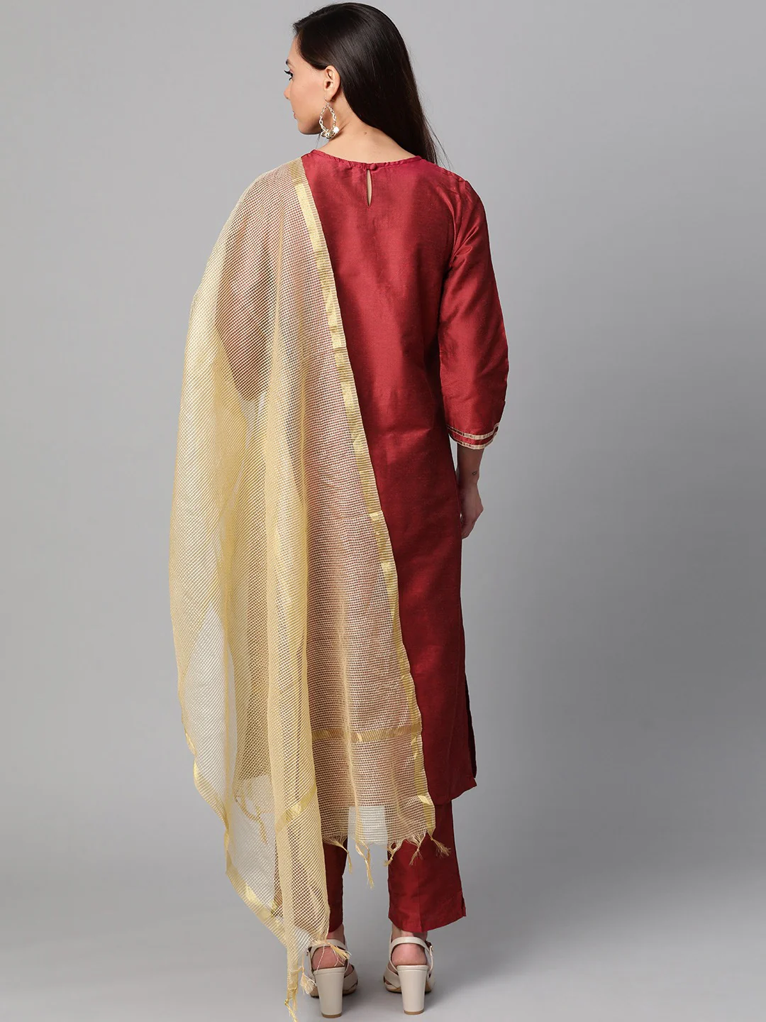 Maroon And Golden Yoke Design Kurta With Trousers