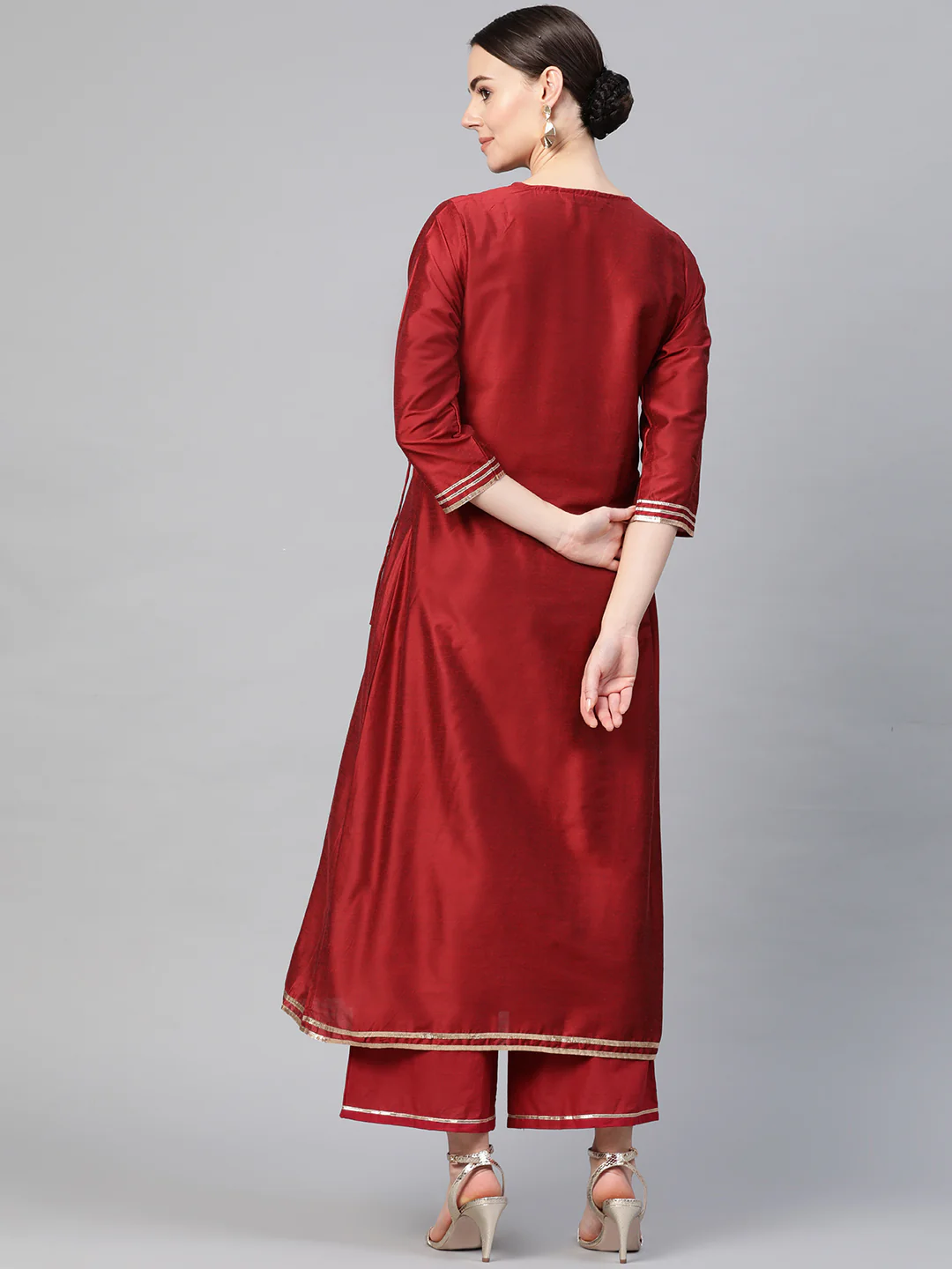 Maroon solid Angrakha A-line calf length kurta with gotta patti and tie-up detail, has a V-neck, three-quarter sleeves, flared hem, front slit, Maroon Solid palazzos with gotta patti detail, has partially elasticated waistband, slip-on closure.