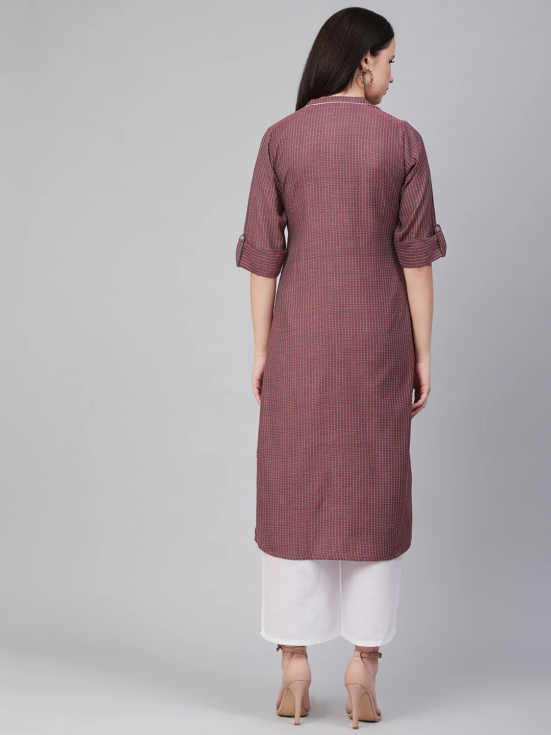 Maroon Striped Thread Work Kurta, Has a Band collar, Three-quarter Sleeves, Calf length With Straight hem