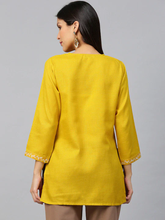Yellow And Off-White Embroidered Straight Tunic, Has A Round Key Hole Neck, Three-Quarter Sleeves