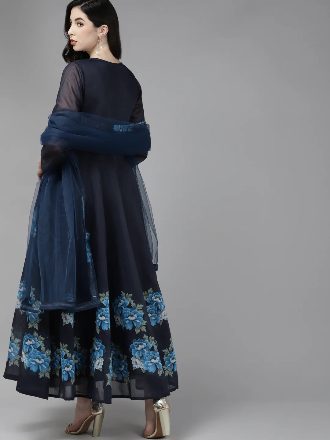 Navy Blue Floral Printed Chanderi Silk Anarkali Kurta With Dupatta