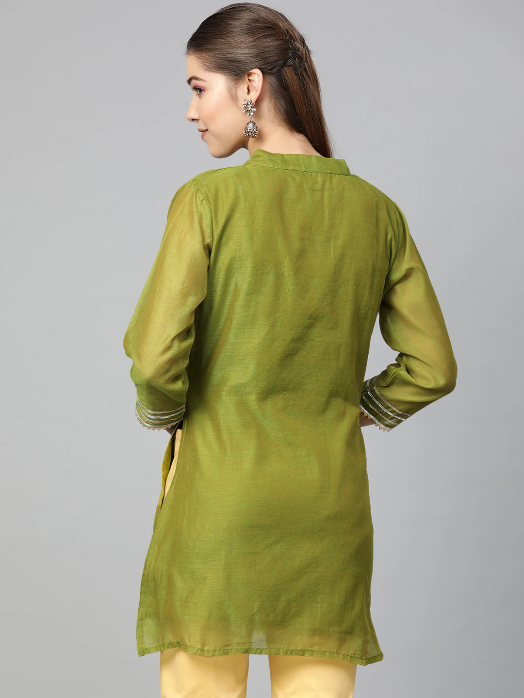 Olive Green Solid Tunic, Has A Mandarin Collar, Three-Quarter Sleeves, And Gotta Patti Detail