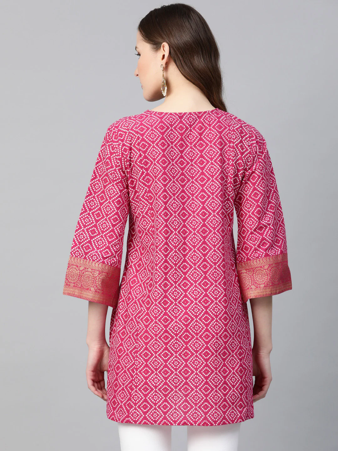 Pink And White Bandhej Print Tunic, Has A Round Key Hole Neck, And Three-Quarter Sleeves