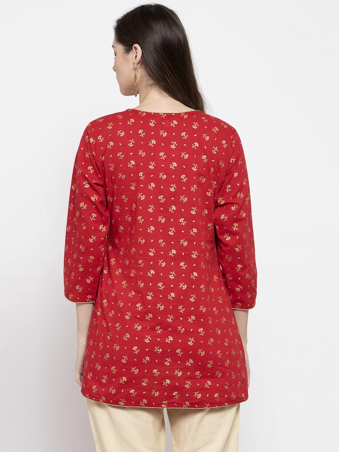 Red And Golden Foil Print Angrakha Tunic With Tie-Up Detail, Has A V-Neck, Three-Quarter Sleeves