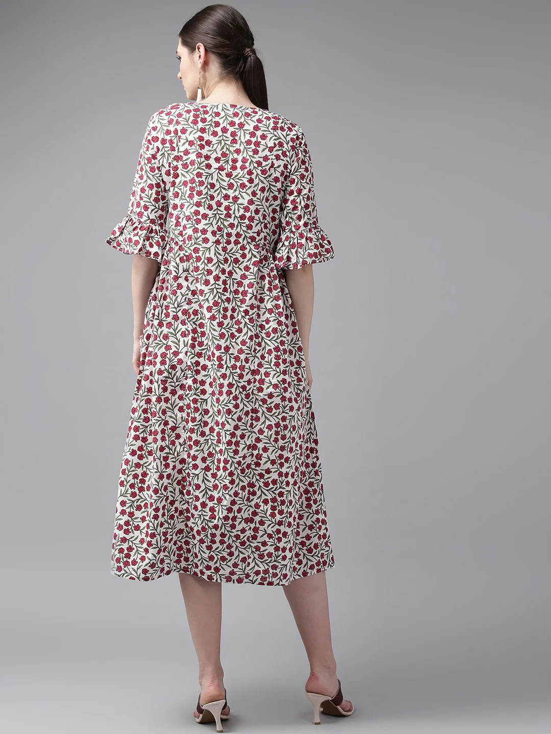 White And Maroon Printed Woven A-Line Kurta With Gathered Detail, Has A Tie-Up Neck, Three-Quarter Sleeves, Two Pockets And Flared Hem