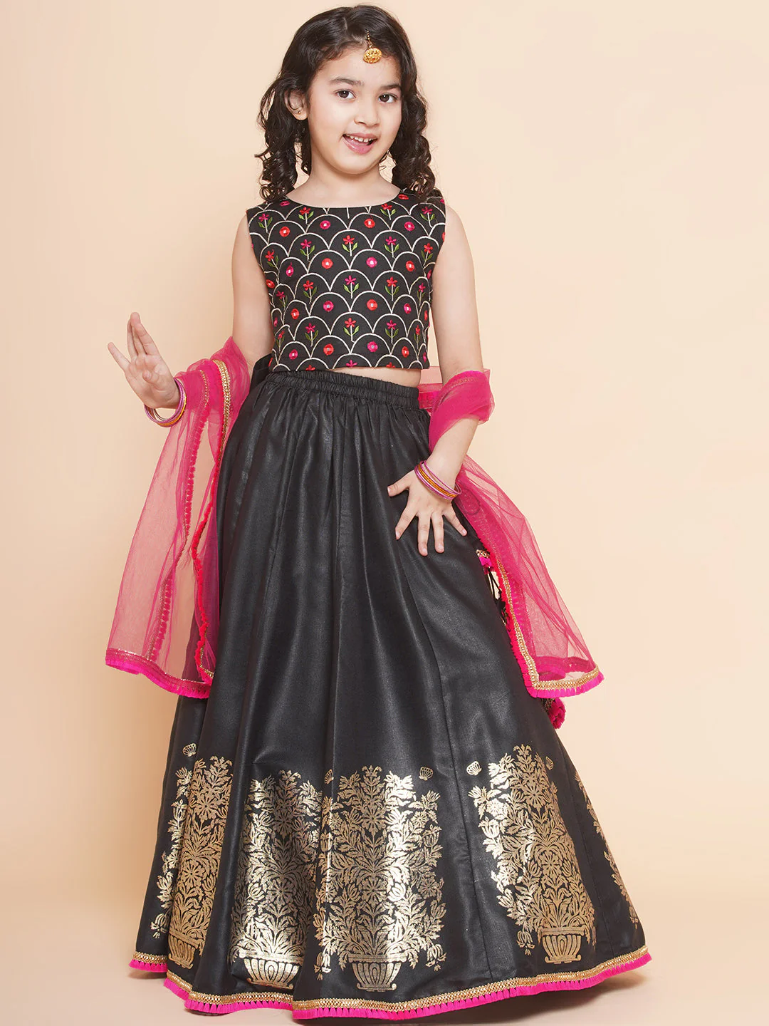 Bitiya By Bhama Girls Black Embroidered Choli, With Printed Lehenga Has A Dupatta