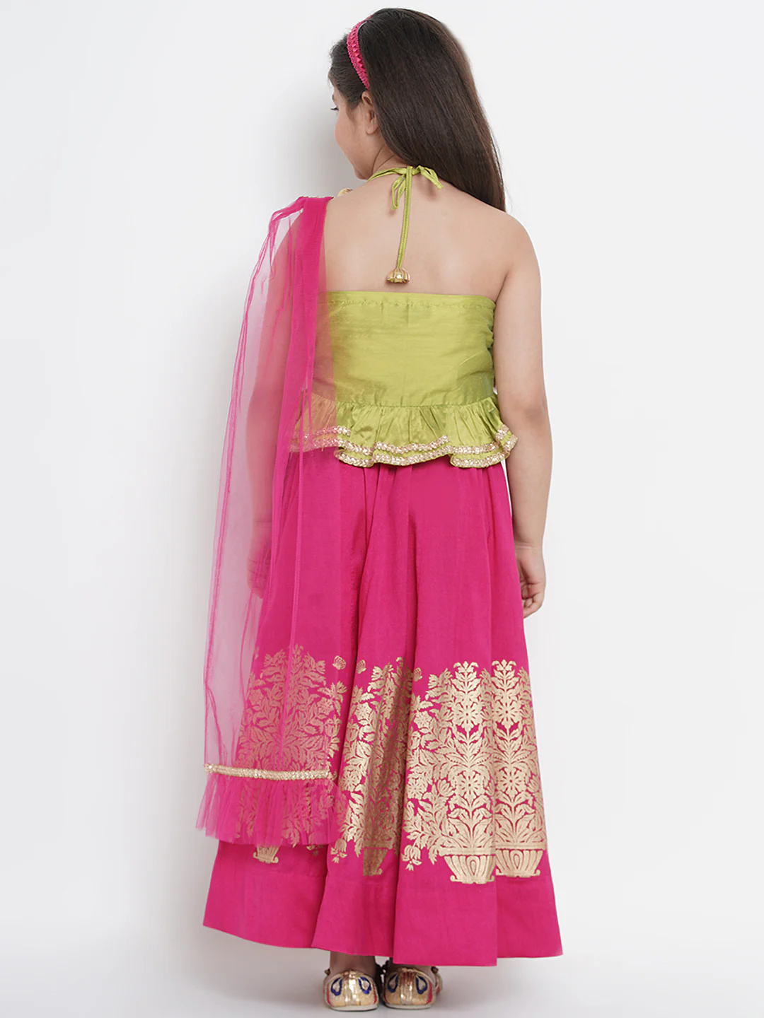 Bitiya By Bhama Girls Green & Fuchsia Solid Ready To Wear Lehenga & Blouse With Dupatta