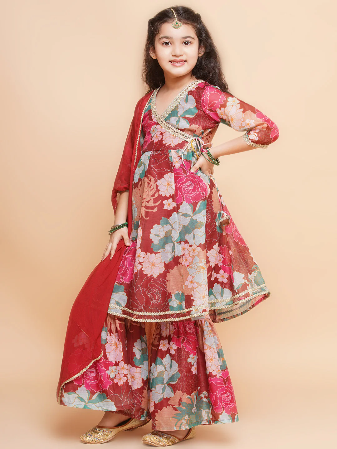 Bitiya by Bhama Girls Maroon Multi Printed Angrakha Kurta with Sharara & Dupatta