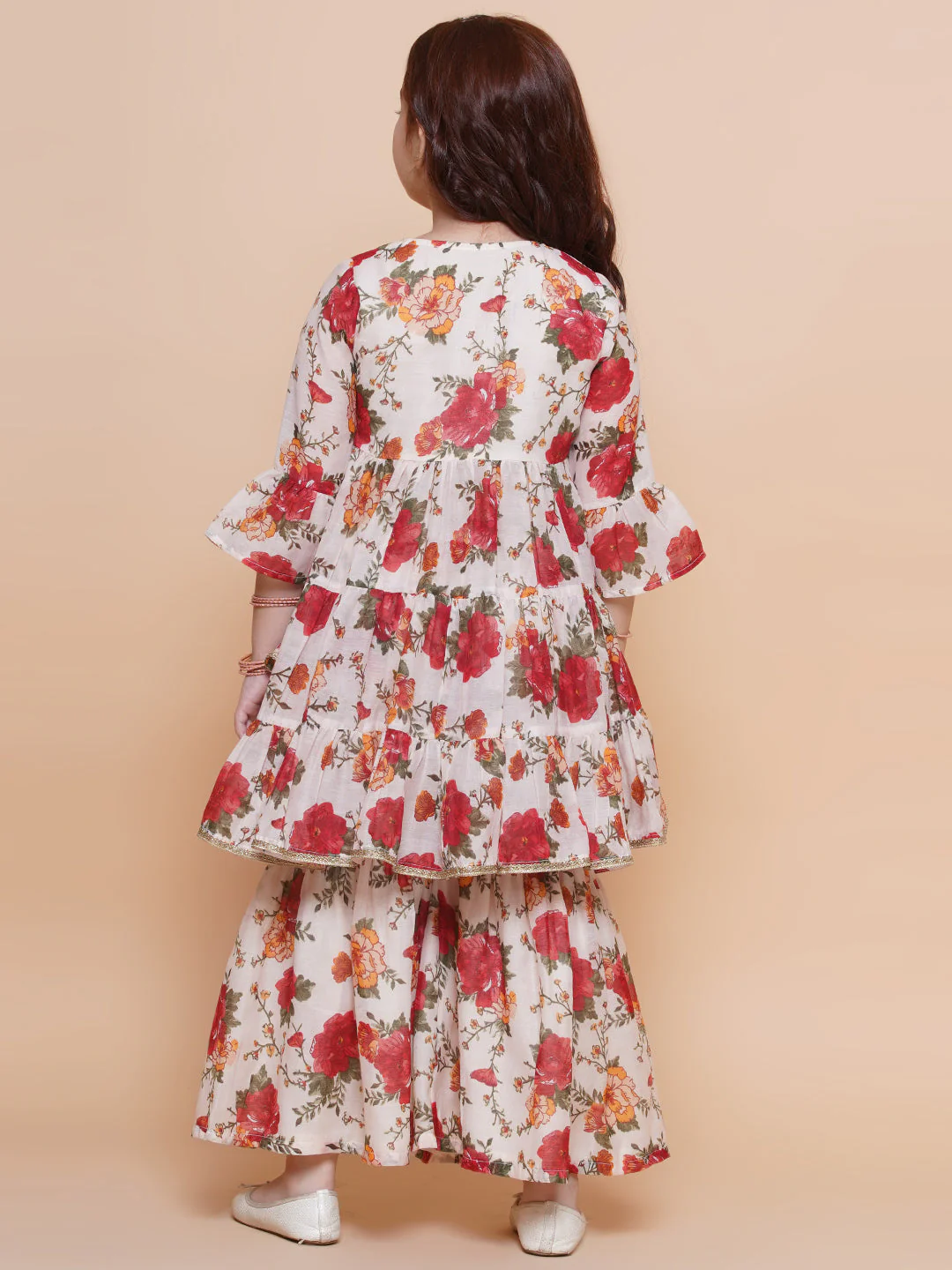 Off white & red Floral printed Angrakha style Kurta has a V-neck, three-quarter regular sleeves Calf length with flared hem with Elasticated waistband Sharara