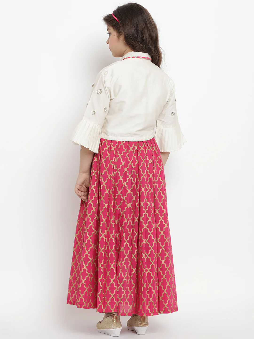 Off-White And Pink Ready To Wear Lehenga Choli Off-White And Pink Ready To Wear Solid Blouse, Has Shirt Collar, Three-Quarter Sleeves Pink And Gold-Coloured Ready To Wear Lehenga, Flared Hem