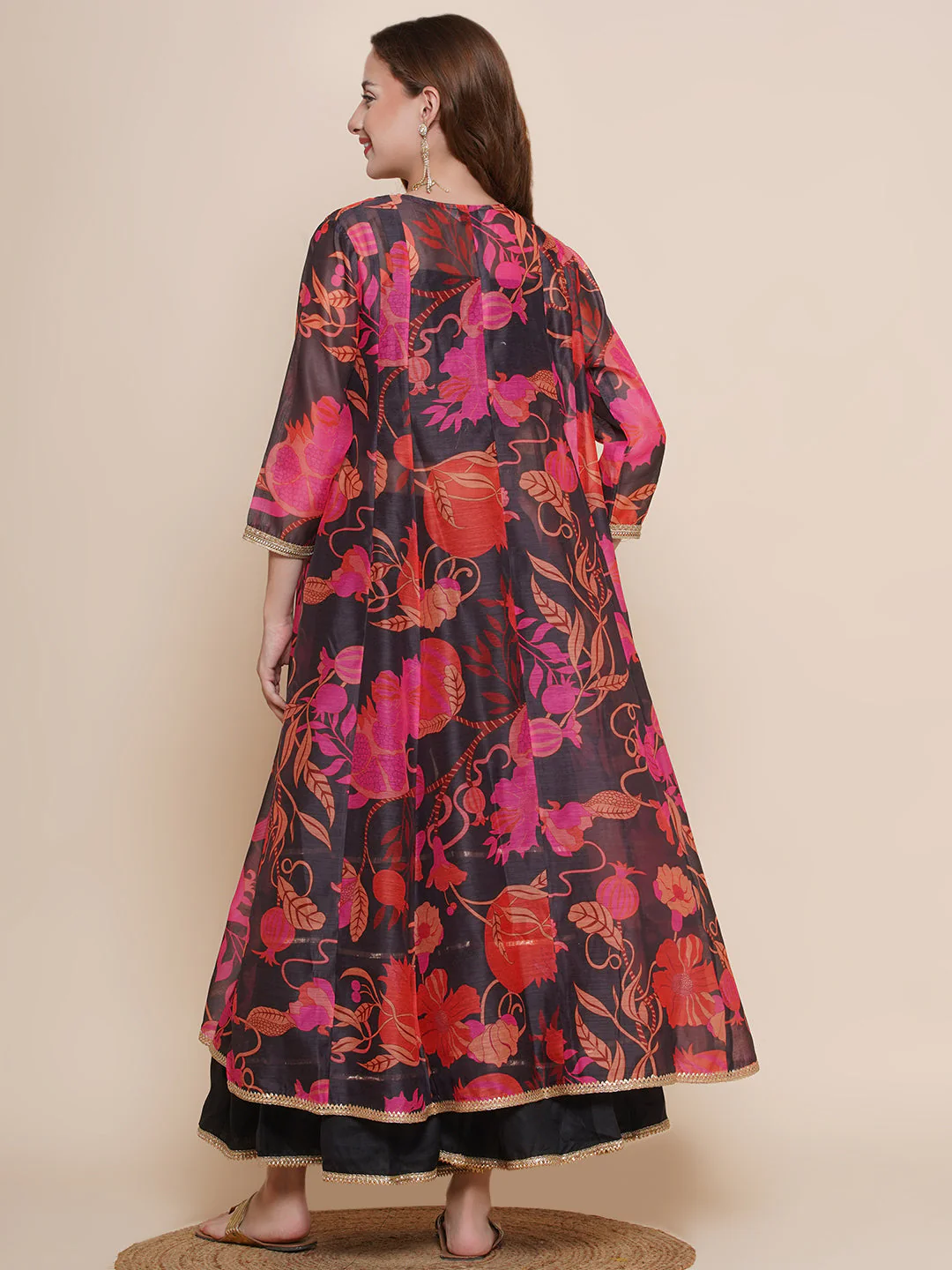 Black Floral printed Jacket, Three-quarter sleeve, has a square neck Camisole with Black Solid gotta patti details Sharara.