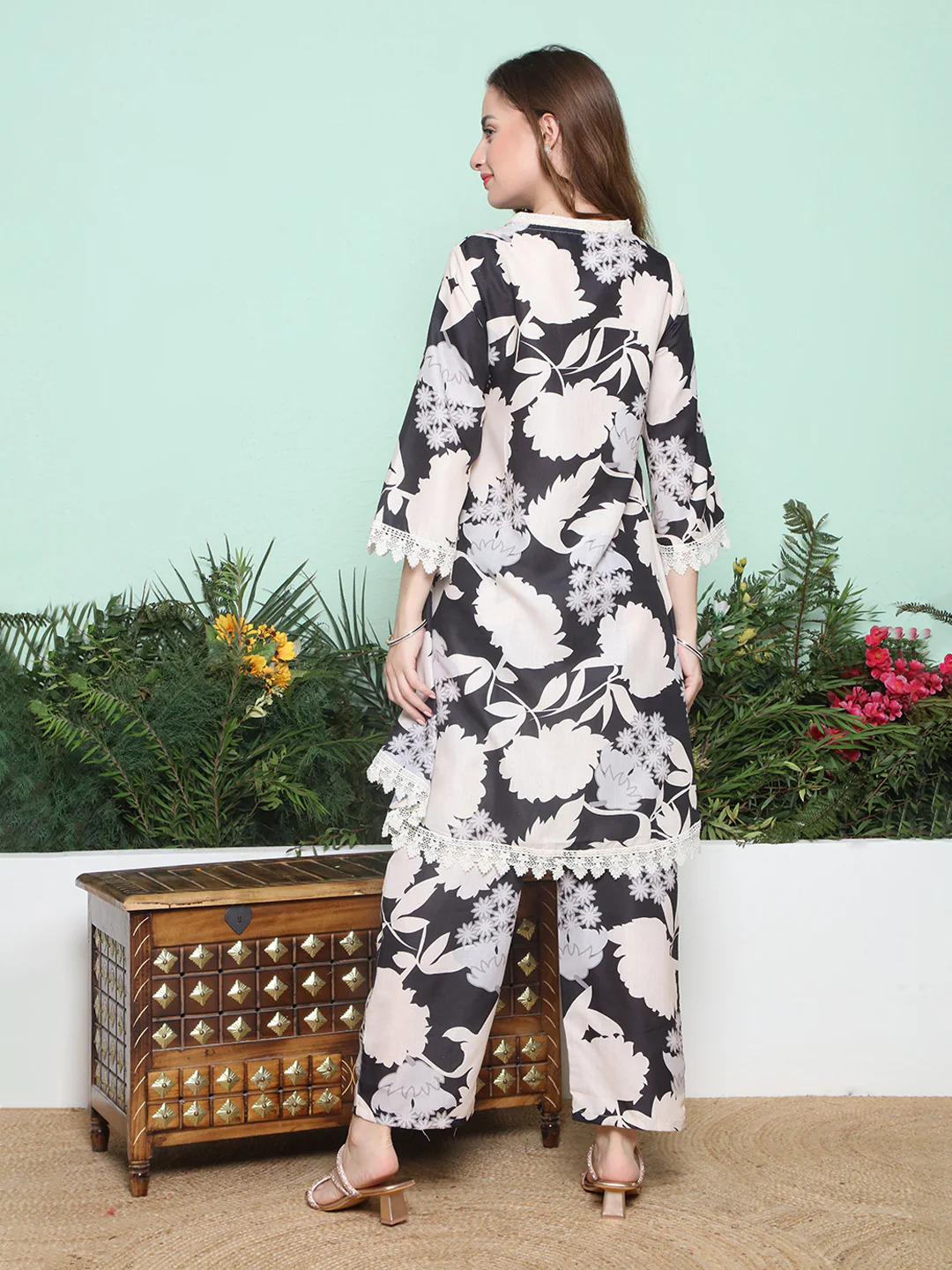 Black Floral Printed Lace Detailing A- Line Shape Kurta, has a V-Neck, Three-quarter sleeves, Above Knee length with flared hem with Pant.