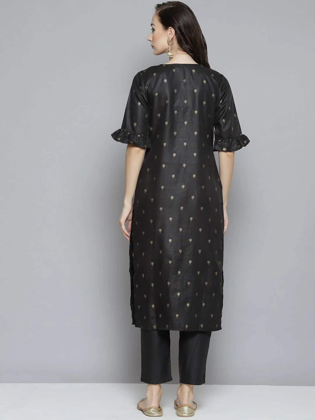 Black woven design Kurta, Has a Keyhole Neck, Three-quarter sleeves, Calf length with straigth hem with Black Solid Pant