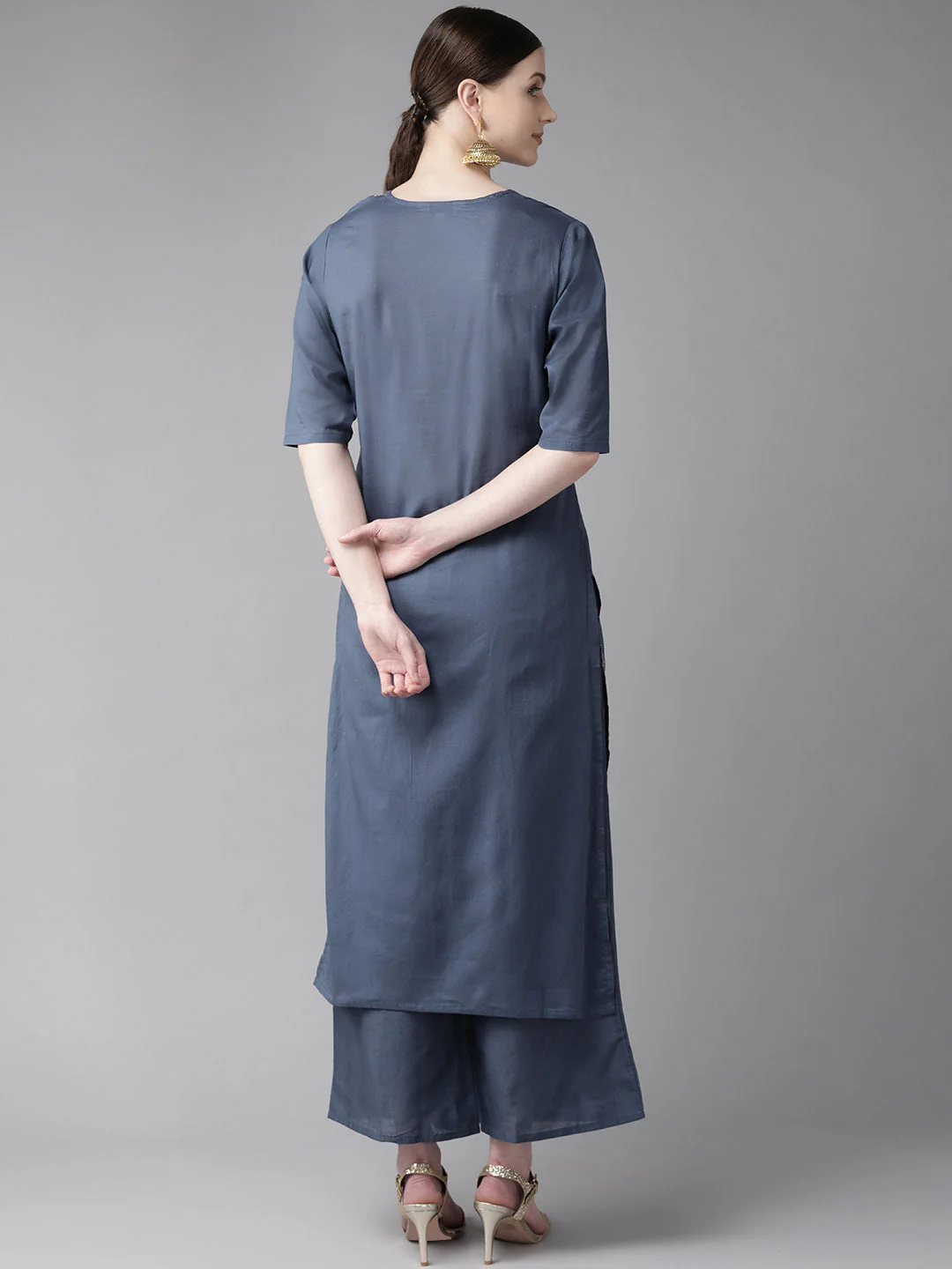 Blue and golden block print straight calf length kurta, has a round neck, three-quarter sleeves, straight hem, side slits, Blue solid palazzos, has partially elasticated waistband, slip-on closure, one pocket.