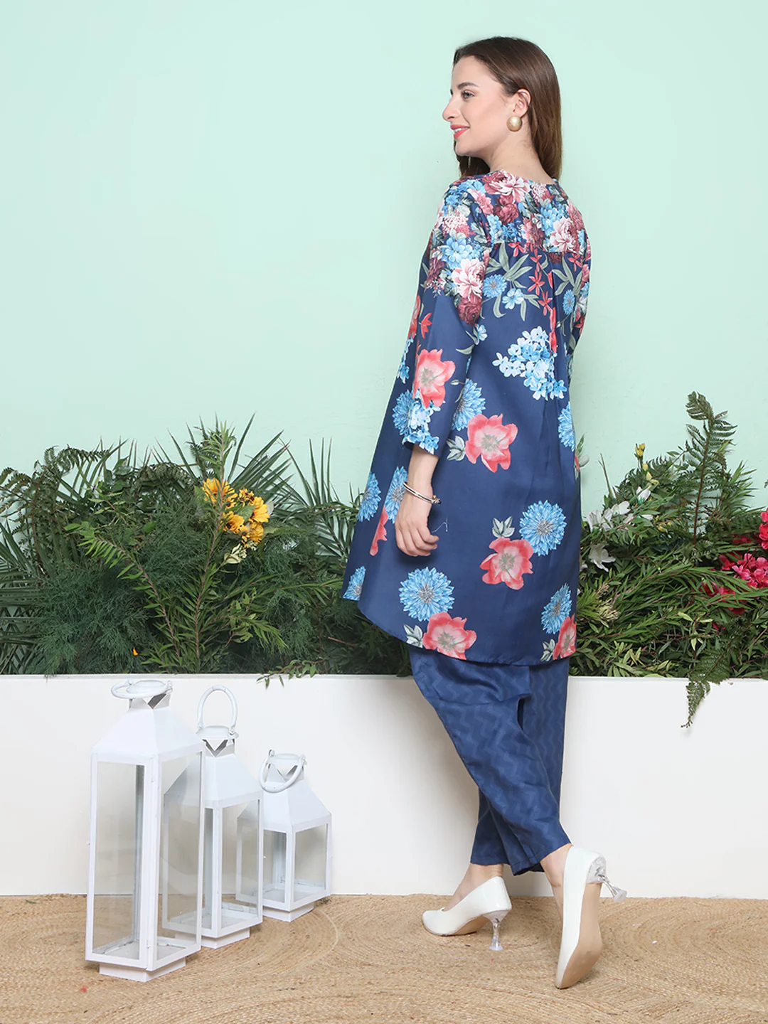 Blue Multi Printed A-Line Kurta, Has a V-neck, Three-Quarter sleeve, Above Knee length with Flared hem with Pant.