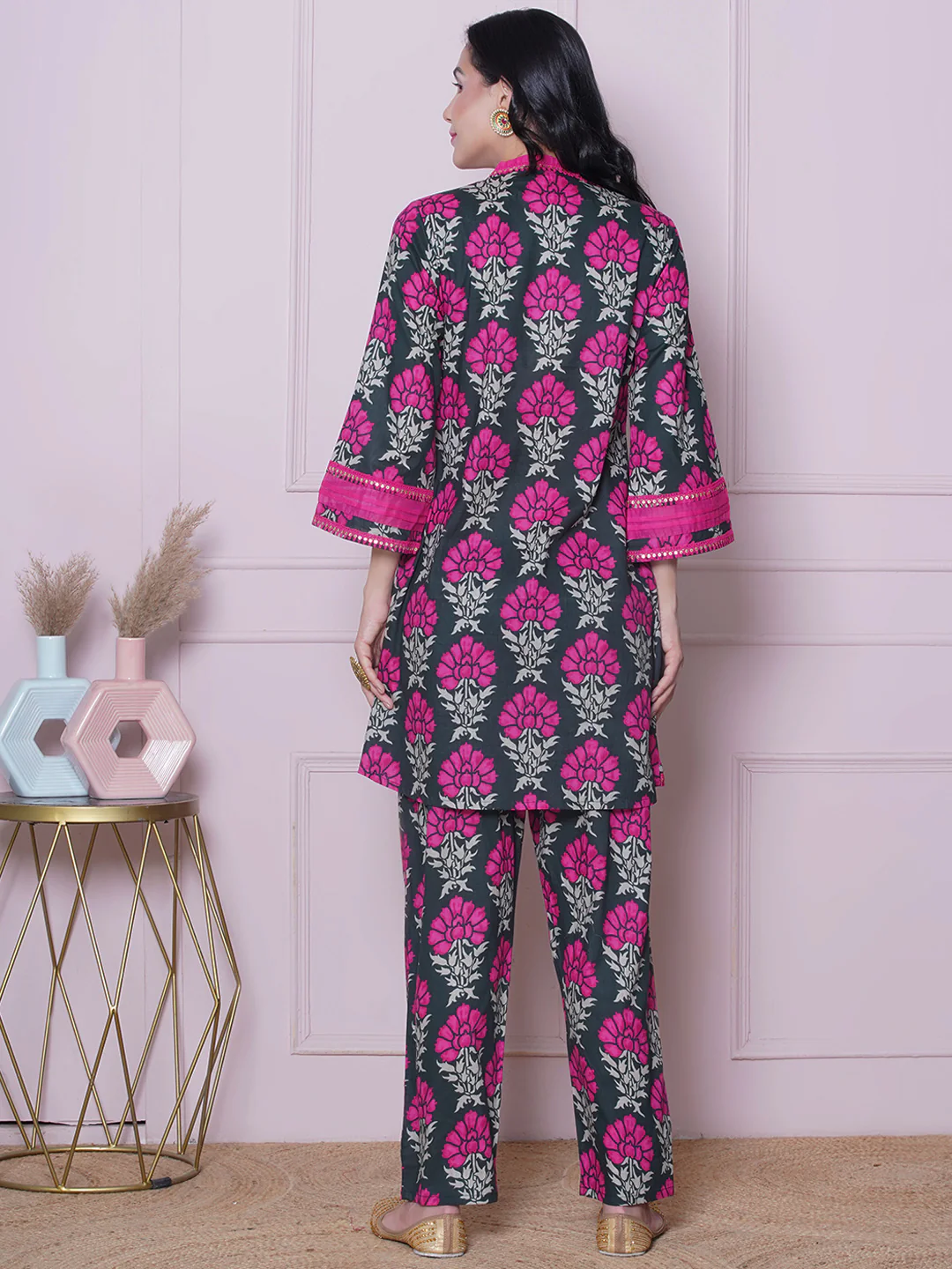Floral Printed V-Neck Pure Cotton Tunic with Trousers