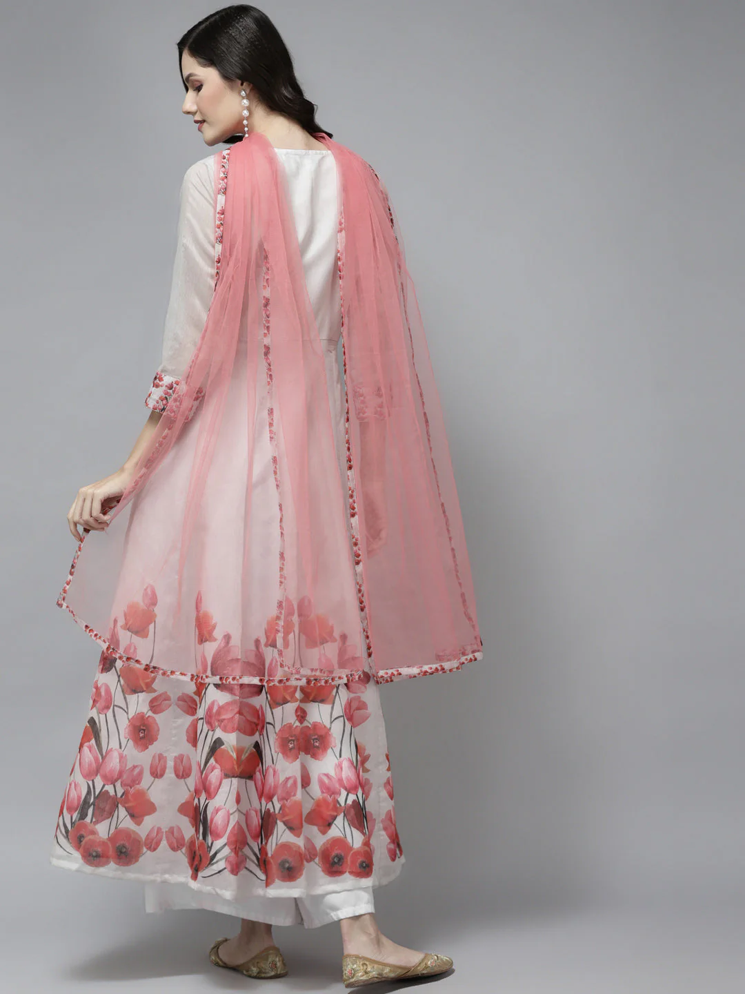 Off White Floral Printed Chanderi Silk Anarkali Kurta, Has A Round Neck, Three-Quarter Sleeves, Ankle Length With Flared Hem With Net Dupatta.