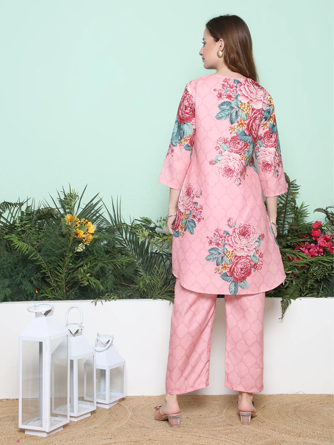 Peach Multi Printed A-Line Kurta, Has a Round Neck, Three-quarter sleeves, Above Knee length with Flared hem with Pant.