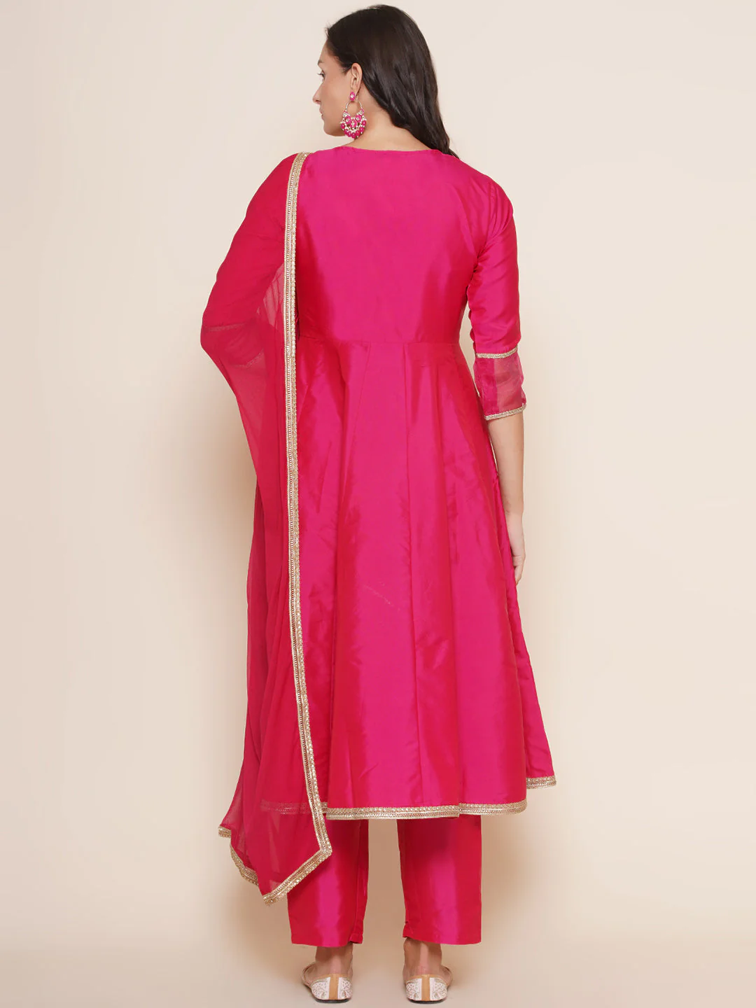 Pink Angrakha Style Yoke Embroidered Kurta, has a V-neck, Three-quarter sleeves, Calf length with flared hem With Pink Solid Palazzo & Dupatta.