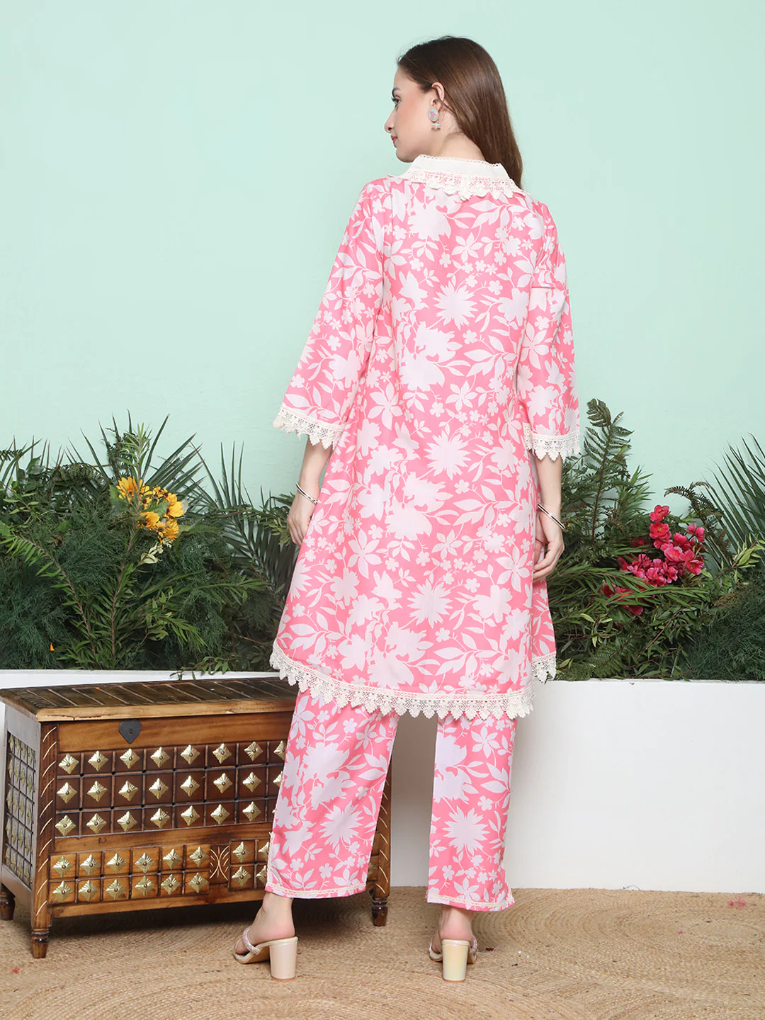 Pink Floral Printed Lace Detailing A- Line Shape Kurta, has a V-Neck, Three-quarter sleeves, Above Knee length with flared hem with Pant.