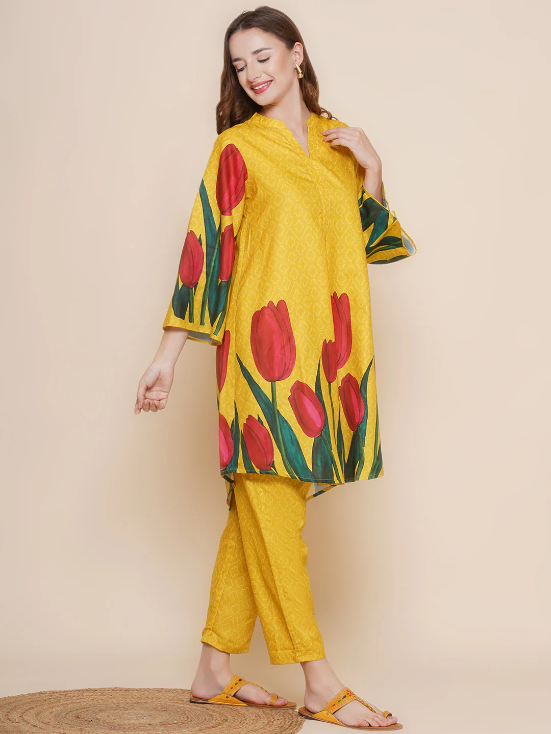 Mustard Yellow Tulip Printed Kurta, has a Mandarin collar, Three-quarter Bell Sleeves, Above Knee length with Flared hem with Mustard Palazzos