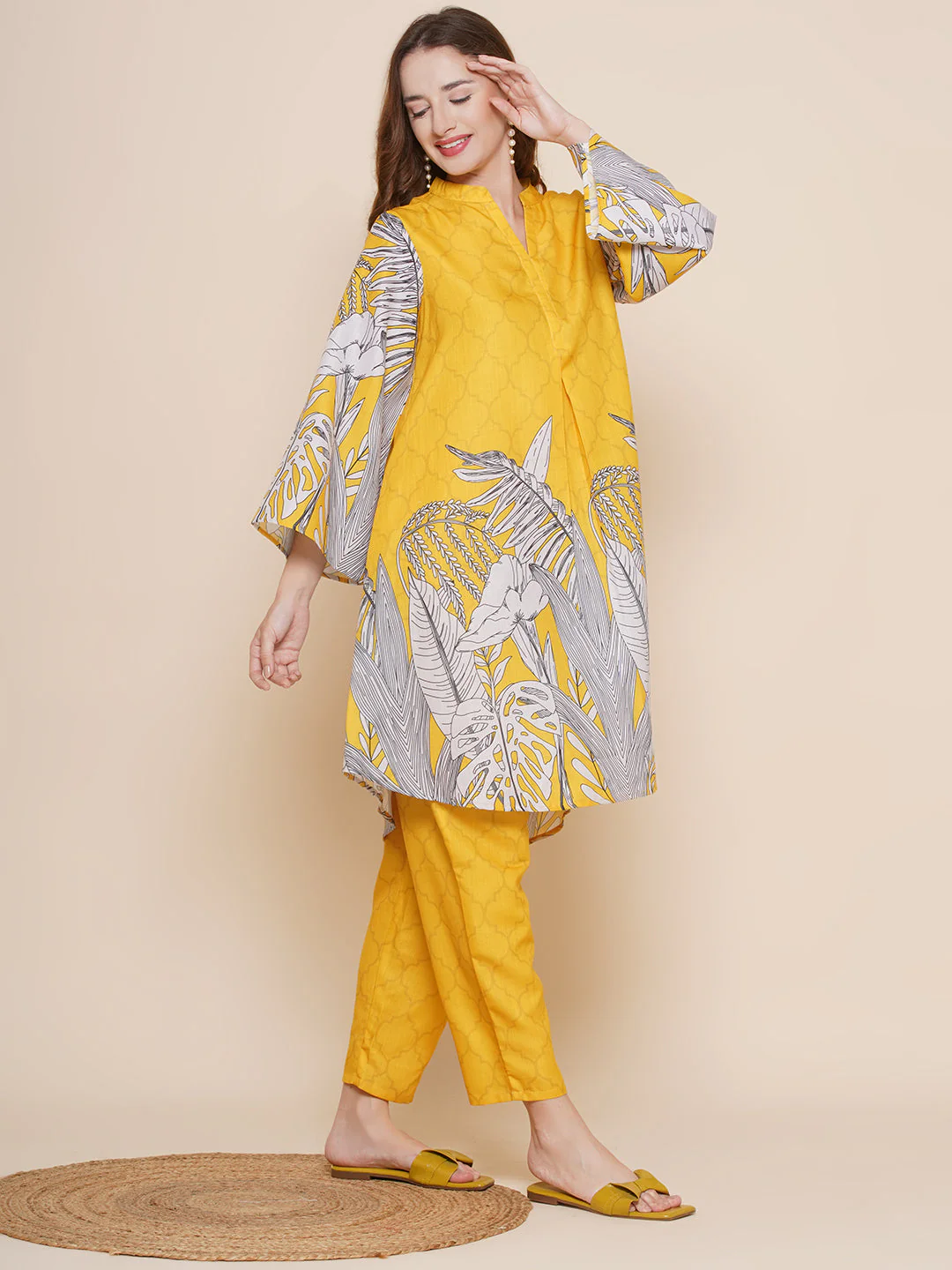Yellow Floral Print A-line kurta, Mandarin collar, Three-quarter sleeve, knee length with Flared hem with Yellow Printed Palazzos.